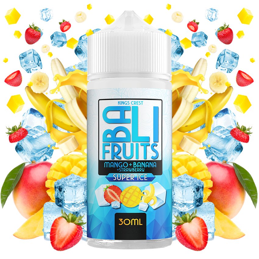 El líquido Mango + Banana + Strawberry Super Ice de Bali Fruits by Kings Crest ofrece una sedosa explosión de mangos, plátanos y una selección de deliciosas fresas, sobre un fondo extra fresco.
